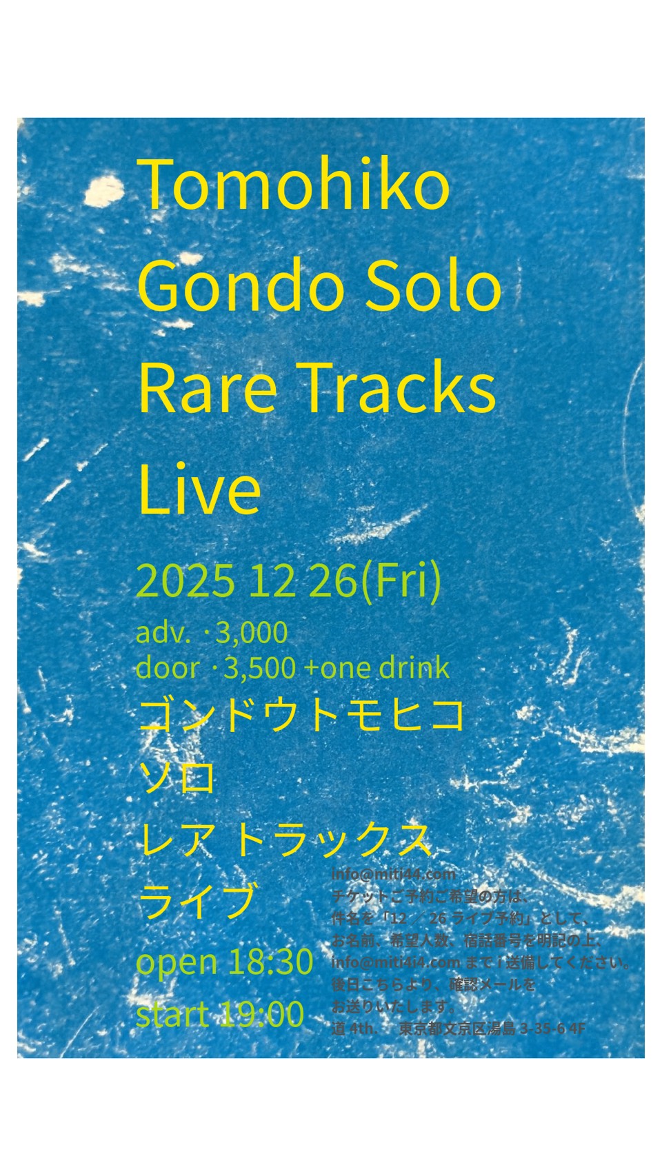 「Tomohiko Gondo Solo Rare Tracks Live」 日時 12月26日(金) 開場 18時30分 開演 19時00分場所 道 4th (東京都文京区湯島3-35-6 4F)料金 予約 3000円… Read More →