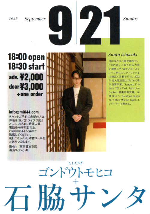 [ゴンドウトモヒコ]9月21日(日)「石脇サンタ+ゴンドウトモヒコ」湯島に出演