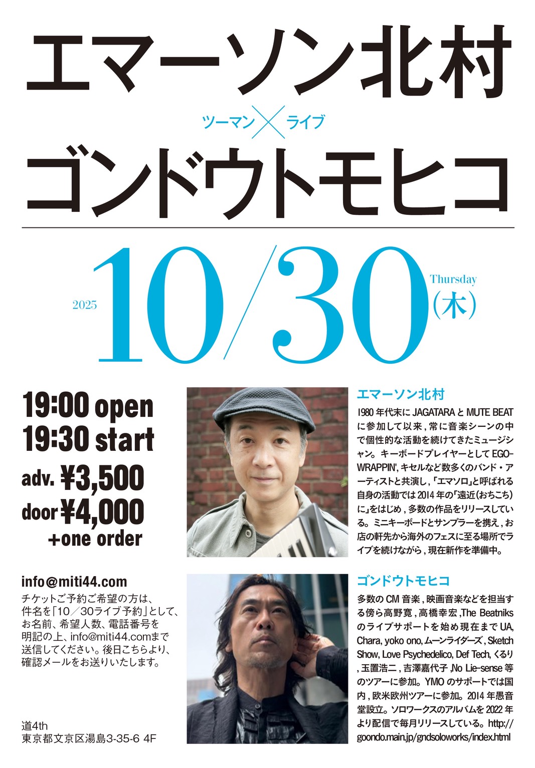 ご予約ご希望の方は、件名を「10/30ライブ予約」として、お名前、希望人数、電話番号を明記の上、info@miti44.comまで送信してください。後日こちらより、確認メールをお送りいたします。
