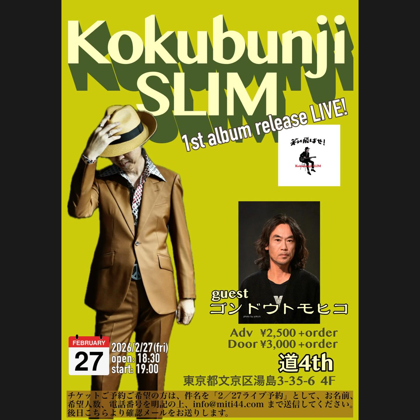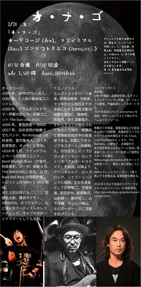「オ・ナ・ゴ (オータコージ、ナスノミツル、ゴンドウトモヒコ)」 日時 2026年2月28日(土) 開場 18時30分 開演 19時00分場所 湯島 道4th (東京都文京区湯島3-35-6 4F)料金 予約 3500円… Read More →